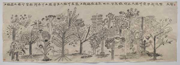 Human/Nature: Artists Respond to a Changing Planet at the Berkeley Art Museum » Xu Bing Mu, Lin, Sen Project 2005–ongoing. Detail: components of the project include a 45-1/4 x 135 inches landscape by the artist, twenty 19 1/2 x 16 in. drawings by Kenyan school children, copies of the primer in Swahili and English and other materials used on-site, photographs, and online auction site. Courtesy of the artist.