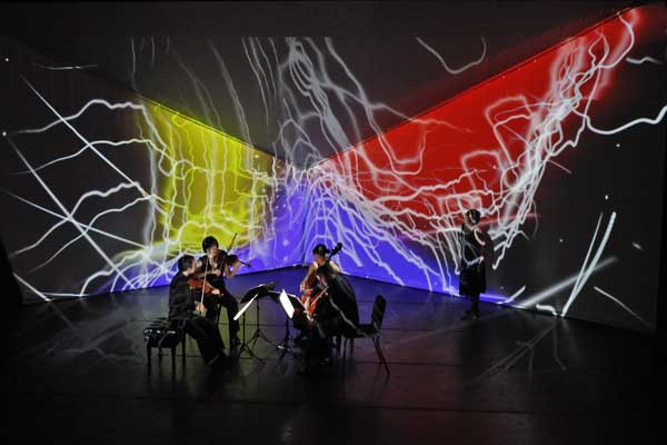 The Blue Rider in Performance at the Miller Theatre, Columbia University » Members of the Brentano String Quartet and soprano Susan Narucki in a performance shot of the concert under review, courtesy the Miller Theatre.
