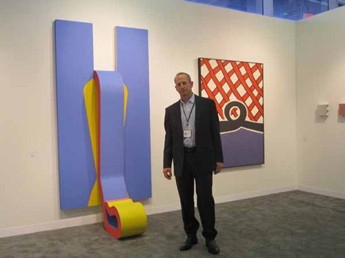 The Armory Show Modern (Pier 92): A photo journal » Dealer Gary Snyder flanked by works by Sven Lukin, 1965, and Nicholas Krushenick, 1962.