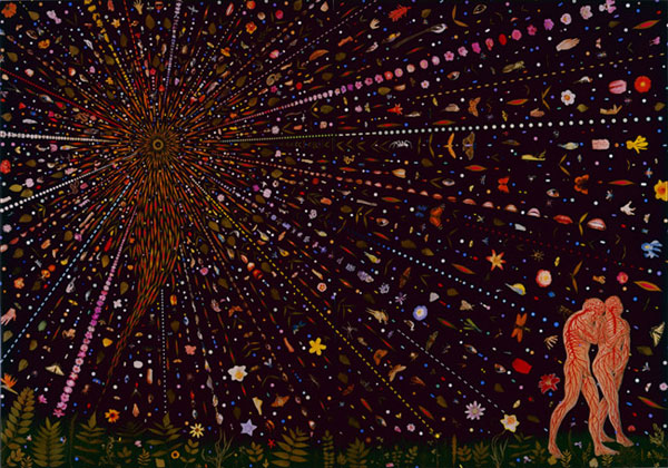 Worth the Trip: Fred Tomaselli lands in Brooklyn » Fred Tomaselli, Untitled (Expulsion), 2000, Leaves, pills, mushrooms, photo collage, acrylic, and resin on wood panel, 84 x 120 inches, Collection of Peter Norton