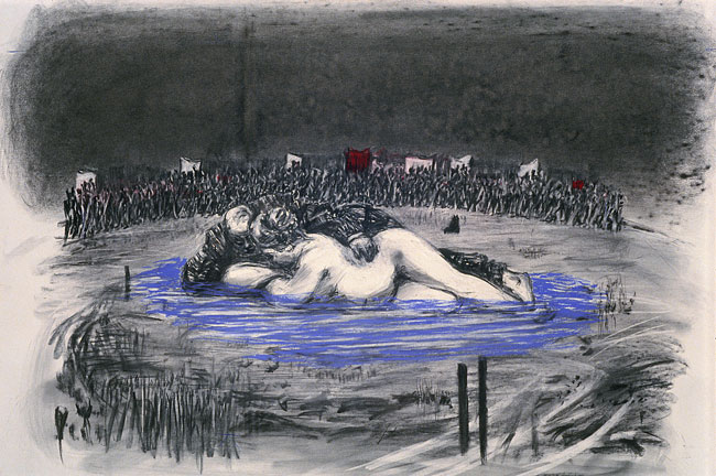 William Kentridge, Drawing for the film Sobriety, Obesity & Growing Old [Soho and Mrs. Eckstein in Pool], 1991. Charcoal and pastel on paper, 47-1/4 x 59 inches. Collection of the artist © 2010 William Kentridge. Photo: John Hodgkiss, courtesy the artist