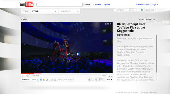 Missing the Magic: YouTube Play at the Guggenheim » a clip of Ok-Go performing at the Guggenheim, October 21, 2010, from the YouTube page under review