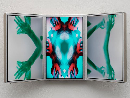 Pipilotti Rist, All or Nothing (alles oder nichts), 2010. Video installation; metal triptych with 3 LCD screens, 3 integrated players, 9 1/2 X 16 7/8 X 3 7/8 inches. Courtesy of Luhring Augustine