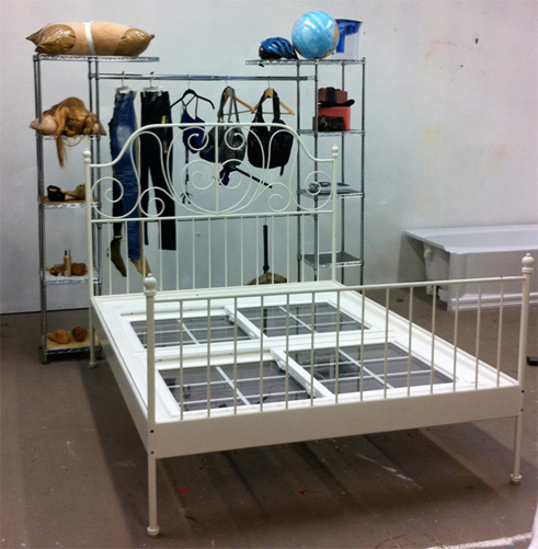 Surfing the Flotsam: Free at the New Museum » Lizzie Fitch (in collaboration with Lauren Boyle, Solomon Chase, and David Toro for DIS, Ryan Trecartin and Telfar Clemens), Pangea, 2010. Bed Frame, wood, windows, clothing, printed material, globe, purses, belts, rocks, sand, paint, clothing rack, plaster, foundation, nails, gloves, eyelashes, pillows, shoes, hangers, video cameras, hammer, tupperware, clothespin, plastic, dimensions variable. Courtesy The New Museum
