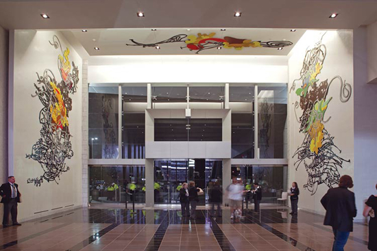 Matthew Ritchie, Line of Play (2009), Powder coated aluminum, vinyl and acrylic.?Approximately 30 feet 6 inches by 20 feet 5 inches. Located in Main Concourse, NW Entry. Photo: James Smith/Dallas Cowboys
