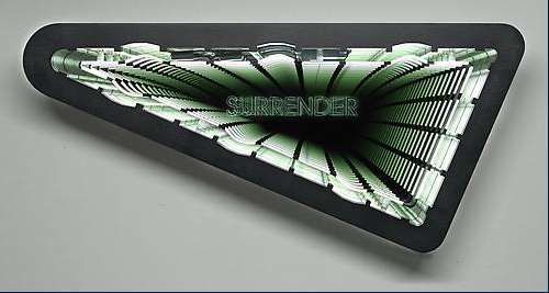April 2011: Carrier, Diaz, and Welish with moderator David Cohen » Ivan Navarro Surrender (Flatiron), 2011. Neon, mirror, one way mirror, wood, paint and electric energy. 23 x 46 x 6 Inches, Courtesy Paul Kasmin Gallery