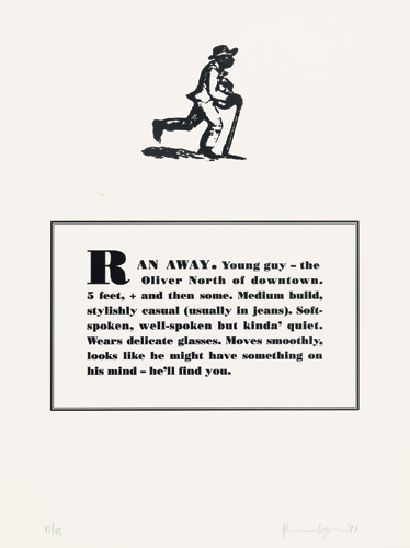 Glenn Ligon, Runaways, 1993. Lithograph, from a suite of ten, 16 x 12 inches. Whitney Museum of American Art, New York; gift of the Peter Norton Family Foundation, 94.29.1-10. Digital image © Whitney Museum of American Art