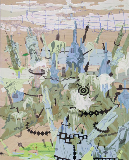Jane Fine in MELT at the Tang » Jane Fine, Battlefield IV, 2004, acrylic and ink on wood panel, 30 x 24 inches. ©2011 Tang Teaching Museum.