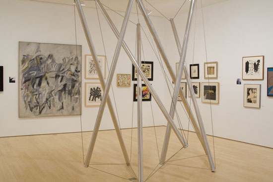 Installation shot of Black Mountain College and Its Legacy exhibition, Loretta Howard Gallery, New York, 2011 featuring, among other works, Kenneth Snelson’s Easter Monday, 1977, foreground, and Jack Tworkov’s Day Break, 1963, to left