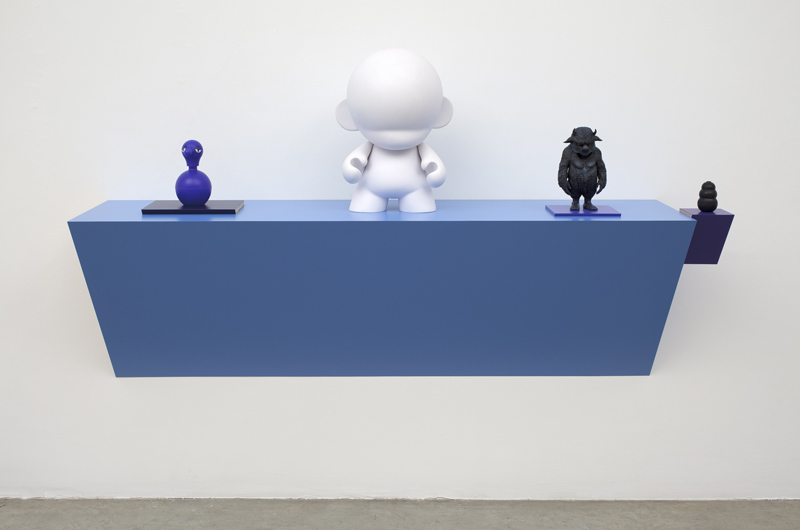 Haim Steinbach, wild things, 2011. Plastic laminated wood shelf, plastic Massimo Giacon “Mr. Cold” soap dispenser, vinyl “Mega Munny”, vinyl Bull “Where the Wild Things Are” figure, rubber dog chew, 40 1/2 x 72 3/4 x 19 Inches, Courtesy Tanya Bonakdar Gallery