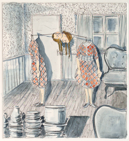 Amy Cutler, Tethered, 2011. Hand-colored working proof sheet, 25 3/16 x 17 3/16 Inches, Courtesy Leslie Tonkonow Artworks + Projects