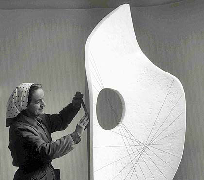 The Yorkshire Connection: Books on British Sculpture » Barbara Hepworth holding a file with the plaster for Curved Form (Bryher II) (November 1961) © Bowness, Hepworth Estate