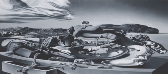 Its a Gray Old World: Grisaille at Luxembourg & Dayan » Glenn Brown, Oscillate Wildly (after ‘Autumnal Cannibalism’ by Salvador Dalí), 1999. Oil on linen, 64 x 154 inches. Courtesy of Luxembourg & Dayan