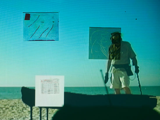 Over Here: Three Americans in London, Testing the Boundaries between Object and Subject » Trisha Baga, Plymouth Rock, 2012. 2 channel video, projected from memory cards, mixed media: acrylic on canvas (3), spray paint on CD player, foil, bubbled-wrapped plinth, box of electrical wires, spray paint and acrylic on phone, water bottle, 27:12 mins. Courtesy of Vilma Gold, London