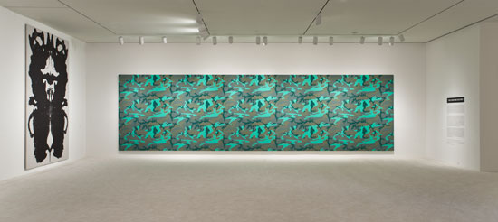 Abstraction Goes Underground: The Painting Factory at LA MoCA » Installation shot of the exhibition under review with, center, Andy Warhol, Camouflage, 1986. Synthetic polymer paint and silk screen on canvas, 118 by 420 inches. Courtesy of The Brant Foundation, Greenwich, CT.