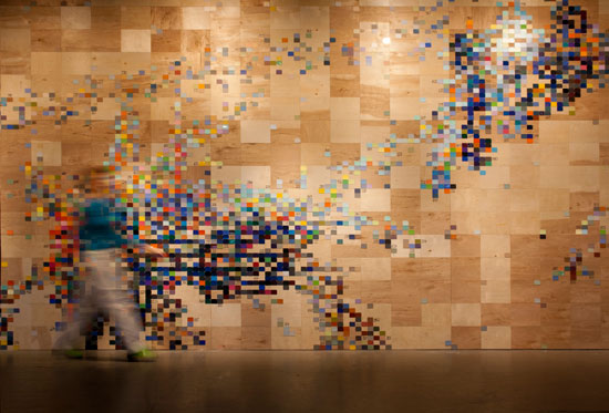 A Peek Into The Medicine Cabinet » Laurie Frick, Making Tracks, 2012. Cut wood, Abet Laminati samples and paint pen, on view in the artist’s solo exhibition at Real Art Ways, Hartford, Conn., December 6, 2012 to March 31, 2013.