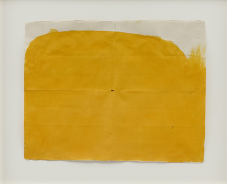 Holding Their Own: Suzan Frecon’s Works on Paper » Suzan Frecon, yellow-orange on more conventional format with 3 holes, 2012. Watercolor on found old Indian paper, 13-1/2 x 17-1/2 inches. Courtesy of David Zwirner, New York
