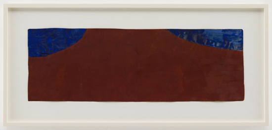 Suzan Frecon, red blue blue, 2012. Watercolor on old Indian ledger paper, 9-1/4 x 27 inches. Courtesy of David Zwirner, New York