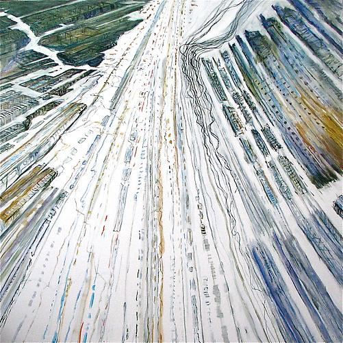 Judith Belzer, Through Lines #27, 2011). Oil on canvas, 64 x 64 inches. Courtesy of Morgan Lehman Gallery