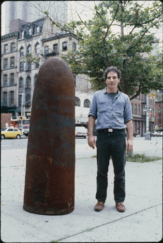 Jene Highstein with his sculpture, Totem, 1980, installed that year in downtown Manhattan. Courtesy of Public Art Fund.