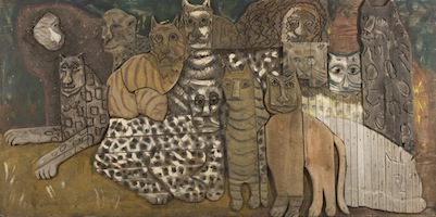 Bernard Langlais, Thirteen Cats, ca. 1967, wood and paint, 48 x 96 x 2 inches. Courtesy of Alexandre Gallery