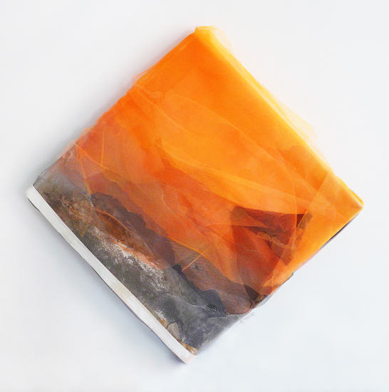 DeShawn Dumas, Of Insincere Delusions, 2013. Starbucks coffee grinds, pages from the Book of Revelation, tulle, fiberglass screen, 18 x 18 inches. Courtesy of the artist and Janet Kurnatowski Gallery.