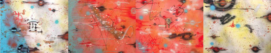 Calligraphy, Meet Graffiti: Calligraffiti at Leila Heller Gallery » Ramellzee, Decision of Sigma War (4 parts), 1984. Spray collage marker on board, 32 x 160 inches. Courtesy of Leila Heller Gallery