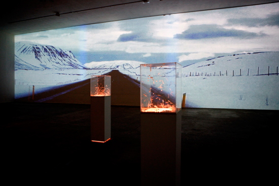 Magnus Sigurðarson, foreground, Contained STORM I & II, pedestal, Plexiglass, fan, and Styrofoam balls; and David Scott Kessler, rear, Lopi: A Traveler’s Saga in Four Divinations, 2013