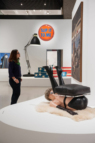 A viewer studies Alain Jacquet’s Déjeuner sur l’herbe, 1964, while seeming to avoid Allen Jone’s Chair, 1969 © Gar Powell-Evans 2013 Courtesy Barbican Art Gallery