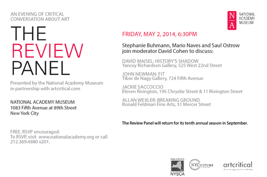 May 2014: Stephanie Buhmann, Mario Naves and Saul Ostrow with moderator David Cohen » revised-flyer-may-2014