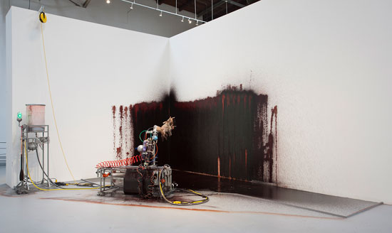 Daniel Joseph Martinez, Redemption of the Flesh: It’s just a little headache, it’s just a little bruise; The politics of the future as urgent as the blue sky, 2008. Computer-controlled animatronic cloned sculptural installation, fiber-glass and animal hair over aluminum, and synthetic “blood,” variable dimensions. Courtesy of the artist and Roberts & Tilton, Culver City, California.