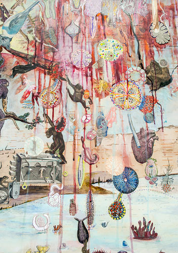 Josh Dorman, Memento Mori (detail), 2014. Ink, acrylic and antique paper on two panels, 56 x 120 inches. Courtesy of the artist and Ryan Lee Gallery.