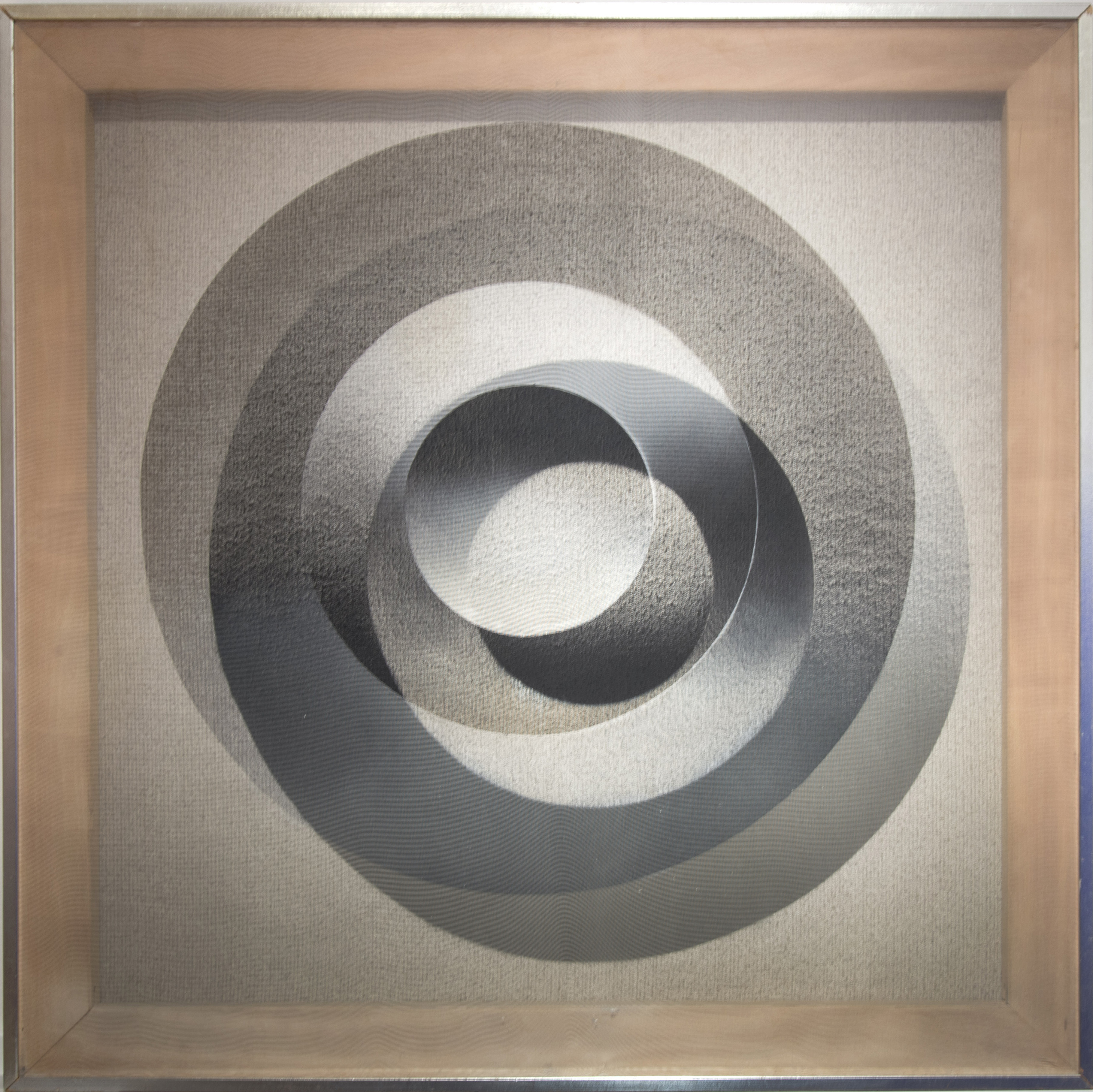 Xanti Schawinsky, Sphera (2859), 1970. Airbrush paint on two layers of stretched guaze on frame, 37 x 36.75 x 1.25 inches. Photograph courtesy of Broadway 1602.