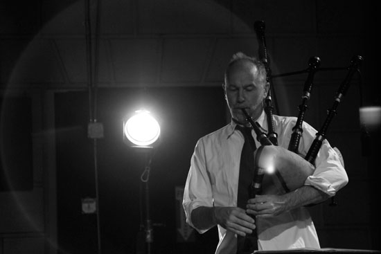 Yoshi and Tashi Wada at Issue Project Room, performance view. Left to Right: David Watson on bagpipes. Photograph by Bradley Buehring, courtesy of Issue Project Room.
