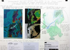 Peter Fend, Über die Grenze: May Not Be Seen Or Read Or Done (Excerpt), 2012. Collage (color laserjet copies, b/w laserjet copies, magazine pages, maps), colored pencil, ink and architectural tape on paper, 50 x 38 inches. Courtesy of the artist and apexart.
