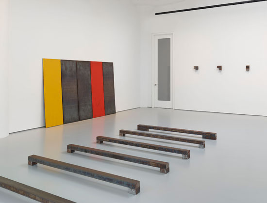 Works by Richard Nonas including Hunk, 2008, foreground, and teel Drawing, 5 Plates: One Red, One Yellow, XX 1988. Courtesy of Fergus McCaffrey