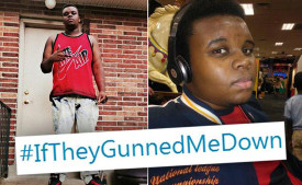 Two pictures of Michael Brown with an overlay of the Twitter hashtag #iftheygunnedmedown. By Big Mike JR Brown, via Facebook.