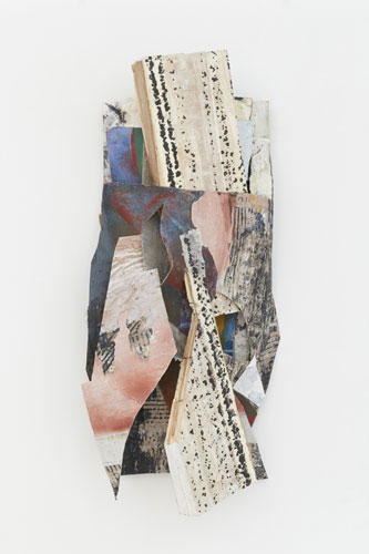 Joseph Montgomery, Image Two Hundred Eleven, 2008–2013. Cedar, paper, canvas, ink, oil, wax, plaster, grout, plastic, sheet metal, and lacquer on MDF and Coroplast, 28 x 12 x 7 1/4 inches. Courtesy the artist and Laurel Gitlen, New York.