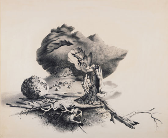 Peter Blume, Rock and Stump, 1942. Black chalk and graphite, stumped with incised lines on cream wove paper, 18 13/16 x 22 7/8 inches. © The Educational Alliance, Inc./Estate of Peter Blume/Licensed by VAGA, New York.