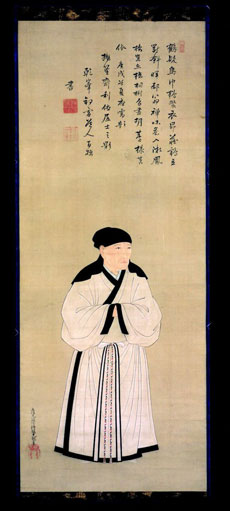Tosa Mitsuoki, Japanese, 1617β1691: Portrait of Sen no Rikyu?, 1670. Hanging scroll; ink and colors on silk. Collection of Jane and Raphael Bernstein.