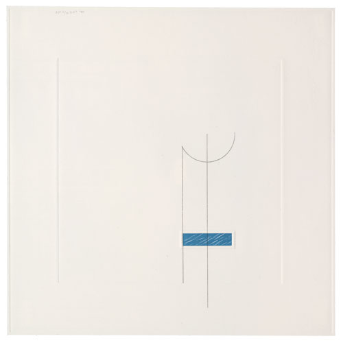 Richard Tuttle, Line, no. 4, 2000. Hard-ground etching with woodblock, aquatint, and chine collé, printed in colors, with copperplate embossing on Hahnemuhle 300 gsm paper, 13 1/8 x 13 1/8 inches. © Richard Tuttle / Brooke Alexander Inc., New York.