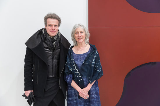 David Cohen and Suzan Frecon in front of Frecon’s painting, earth takes its guidelines, 2014 at the private view of her current exhibition. Photo: Scott Rudd