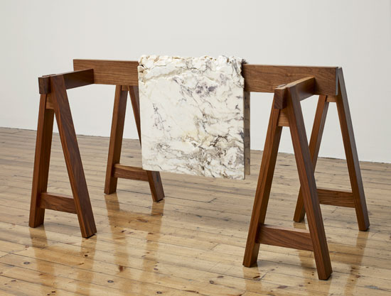 Analia Saban, Draped Marble (Fior di Pesco Apuano), 2015. Marble slab on steel on wooden sawhorse, 99.1 x 177.8 x 91.4 cm. Courtesy of the artist and Spru?th Magers.
