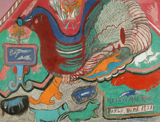 Nellie Mae Rowe, Early Bird, 1981. Paint and crayon on canvas, 20 x 24 inches © Nellie Mae Rowe, Shaun Gillen Photography