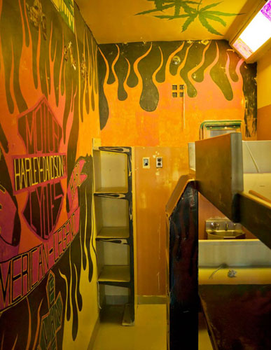 Geoffrey James, Cell decorated with Harley Davidson and East Van Logos, 2013, archival inkjet print. Courtesy of the artist.