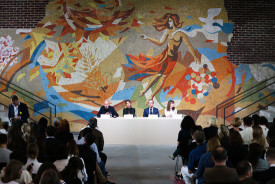 A panel discussion on the museum with Anton Belov, Rem Koolhaas, Dasha Zhukova, and Kate Fowler, in front of a mosaic by Ilya Ivanov. Photograph © 2015 by David X Prutting, courtesy of the Garage Museum.