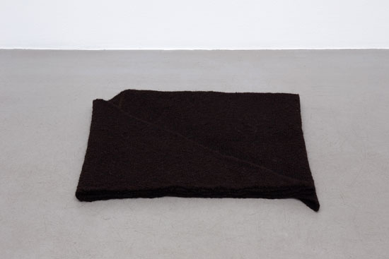 Helen Mirra, Folded waulked triangle, 2015. Undyed wool from two black sheep, strand of wool dyed with boletopsis sp., 46 x 50 x 4 cm. Courtesy of the artist and Galerie Nordenhake.