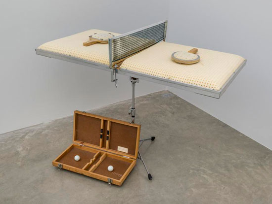 Bill Beckley, Silent Ping-Pong, 1971. Foam, aluminum, plywood, steel, netting; table: 38.5 x 48.5 x 26 inches, two paddles: 10.5 x 6.5 x 1.5 inches. Courtesy of the artist and Albertz Benda.