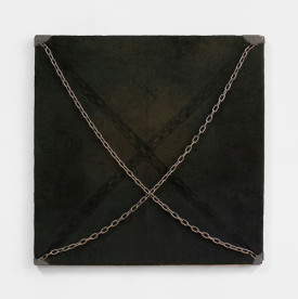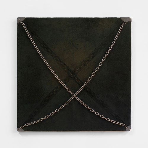 Davina Semo, I MAKE MYSELF STILL, TO LISTEN, 2015. Stainless steel chain, leather, and pigmented reinforced concrete; 36 x 36 x 2 1/4 inches. Courtesy of the artist and Lyles & King.