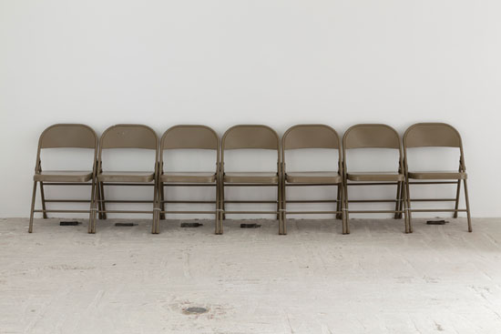 Davina Semo, I AM A PATIENT GIRL; I WAIT I WAIT I WAIT I WAIT, 2015. Steel folding chairs, cast stainless steel, zip ties; dimensions variable. Courtesy of the artist and Lyles & King. Photograph by Charles Benton.